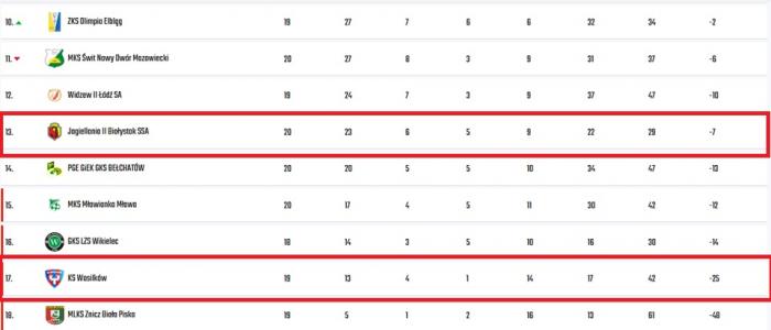 Pozostali wyniki 20. kolejki: Świt Nowy Dwór Mazowiecki - Legia II Warszawa 0:1, PGE GiEK Bełchatów - KS CK Troszyn 0:3, ŁKS Łomża - KS Wasilków 2:1, Lechia 1923 Tomaszów Mazowiecki - Znicz Biała Piska 7:1, Wisła II Płock - Broń 1926 Radom 0:0, Olimpia Elbląg - Ząbkovia Ząbki 3:1, Mławianka Mława - Warta Sieradz 2:3.