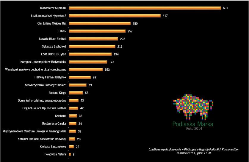 W pierwszej dziesiątce znalazły się Olej lniany Olejowy Raj, BiKeR Białostocka Komunikacja Miejska Rowerowa, Suwałki Blues Festival, Sękacz z Suchowoli, Łódź Balt 818 Tytan. Najmniej głosów zdobyły dwie propozycje kulinarne Polędwica Natura i Kiełbasa Kindziukowa.