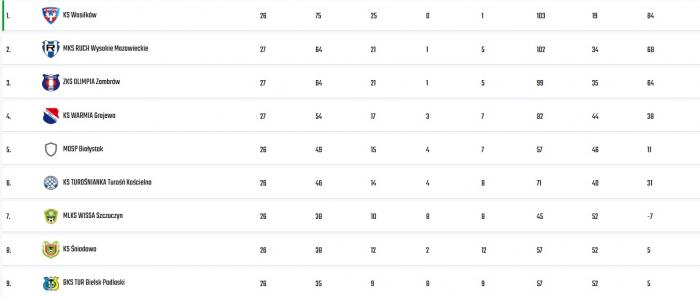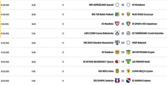 Ruch Wysokie Mazowieckie - MOSP Białystok 5:3 (3:3). Bramki: Kamil Jackiewicz 2, 66, Tymoteusz Kostro 5, Paweł Brokowski 14, Kamil Sakowicz 90+5 - Mikołaj Siemieniuk 27, Kacper Łupiński 40, Damian Danielewicz 45+2. Żółte kartki: Kamil Jackiewicz, Jakub Kaliszczyk, Damian Decewicz, Tymoteusz Kostro, Kamil Sakowicz (Ruch), Olivier Ambrożej, Wiktor Gęgotek (MOSP). Sędziowała: Magdalena Ostrowska.