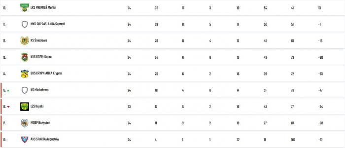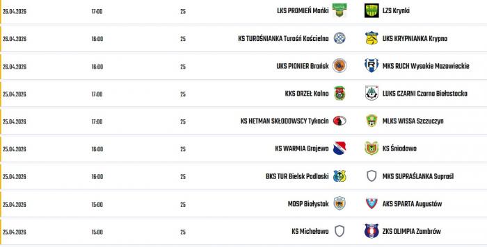 LZS Krynki - Olimpia Zambrów 1:2 (0:0). Bramki: Mikita Zatouka 87 – Krystian Mantur 61, Przemysław Jastrzębski 63. Żółte kartki: Adrian Karankiewicz, Marcin Pawnuk (LZS Krynki), Janusz Dmochowski, Junior Radziński, Krystian Mantur (ZKS OLIMPIA Zambrów), (ZKS OLIMPIA Zambrów). Czerwone kartki: Adrian Karankiewicz (90+4, LZS Krynki - za 2. żółte). Sędziował: Paweł Kostko.