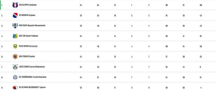 IV liga nabiera tempa, ale coraz mniej tematów jest w niej oczywistych. Nawet i to, że zambrowska Olimpia bez żadnych wątpliwości zostanie mistrzem, bo ekipa zaliczyła lekką zadyszkę. Skromna wygrana 2:1 w Krynkach z LZS nie jest najbardziej przekonującym dowodem, że kryzys drużyny Michała Kolankowskiego już jest w pełni opanowany. Za to coraz bardziej rozpędzają się Warmia Grajewo i Tur Bielsk Podlaski. Poniżej raport z kolejki (składy, strzelcy, kartki, sędziowie) oraz rozkład gier na następną serię.