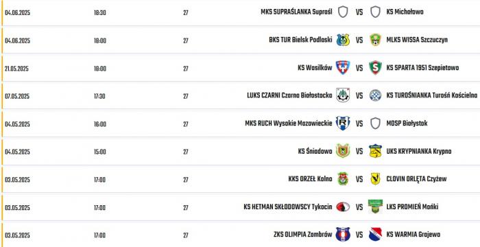 Wissa Szczuczyn - KS Wasilków 0:8 (0:1). Bramki: Paweł Bernacki 3, 86, 88, Jakub Kruszewski 46, Kacper Ptasiński 66, Damian Toczydłowski 73, 83, Jakub Witkowski 77. Żółte kartki: Jakub Borys (Wasilków), Yehor Skarina, Krystian Dzięgielewski, Mariusz Łapiński (Wissa). Czerwona kartki: Denys Kravchuk (9, Wissa). Sędziował: Dominik Bućko.