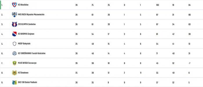 W Grajewie czwarta w stawce Warmia podejmowała wicelidera z Wysokiego Mazowieckiego. Po zaciętym i wyrównanym meczu ekipa "Wilczków" wygrała 2:1 i zmniejszyła stratę do podium do 3 punktów.