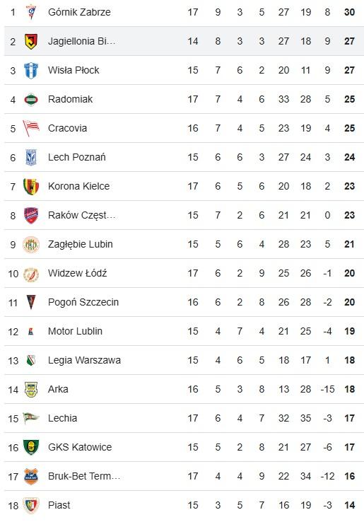 Wyniki: Piast Gliwice - Widzew Łódź 0:2, Radomiak Radom - Górnik Zabrze 4:0, Lechia Gdańsk - Bruk-Bet Termalica Nieciecza 5:1, Korona Kielce - Cracovia Kraków 0:1.