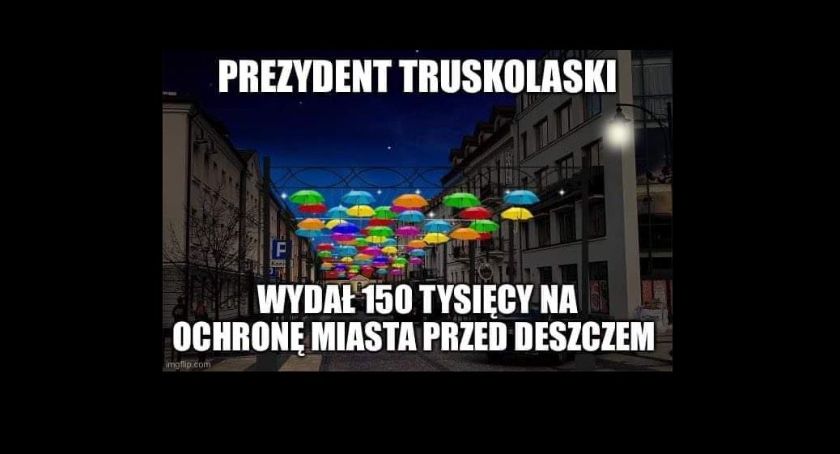 „#Białystok od lat podczas każdej większej ulewy jest dotkliwe zalewany. Rządząca miastem ekipa na czele z T. Truskolaskim wciąż nie ma pomysłu co zrobić z tym problemem, za to w tym roku, - jak się dzisiaj dowiadujemy z prasy – postanowiła wydać 150 tys. zł na… ozdobne parasolki, które zawisną nad ul. Kilińskiego” – napisał na swoim profilu na Twitterze radny Sebastian Łukaszewicz.