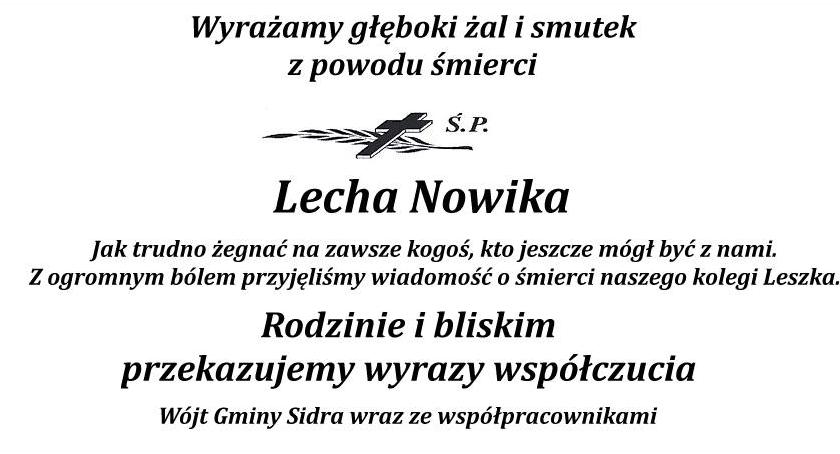 W środę 10 października policja została poinformowana o śmierci Lecha Nowika, kandydata na wójta Sidry w powiecie sokólskim. Według wstępnych ustaleń mężczyzna popełnił samobójstwo i zostawił list pożegnalny. Ciało znaleziono około 21, sprawą zajęła się dąbrowska policja i prokuratura.