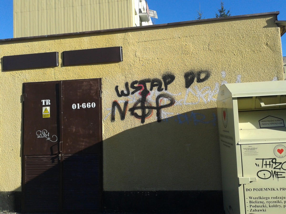 Białostockie osiedla pełne są bohomazów. Chyba nie ma ulicy, na której nie dałoby się zauważyć głupich napisów, obraźliwych treści lub w ostateczności niesmacznych żartów. Większość takich obrazków robią wcale nie artyści, ale chuligani, wandale, a już na pewno nie patrioci. Patriota wszak szanuje swój kraj, mienie i pracę drugiego człowieka. Napisy, jak ten widoczny na zdjęciu, są zwyczajnie głupie i zamiast zachęcać do organizacji, ośmieszają ją. Między innymi za takie bohomazy Straż Miejska wlepia mandaty, jeśli tylko znajdzie „twórcę”.