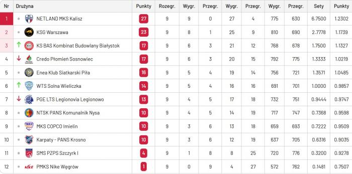 Wyniki 9 kolejki: Enea KS Piła - Credo Płomień Sosnowiec 3:0, Karpaty-PANS Krosno - PMKS Nike Węgrów 3:0, PGE LTS Legionovia Legionowo - Netland MKS Kalisz 0:3, WTS Solna Wieliczka - NTSK PANS Komunalnik Nysa 3:0.
