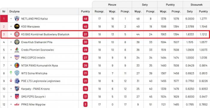 To była pierwsza tak gładka porażka ekipy KS BAS Kombinat Budowlany przez własną publicznością. Dotąd zespół Michała Muszyńskiego przegrał raz przed własną publicznością (2:3 z KS Piła), ale przynajmniej zdobył punkt. Sobotnia przegrana z wiceliderkami ze stolicy KSG Warszawa 0:3 jest bardziej bolesna: białostoczanki nie ugrały nawet seta nie mówiąc o poprawieniu punktowej zdobyczy. Mimo przegranej ich pozycja w tabeli nie uległa pogorszeniu: BAS dalej zajmuje 3. miejsce w tabeli.