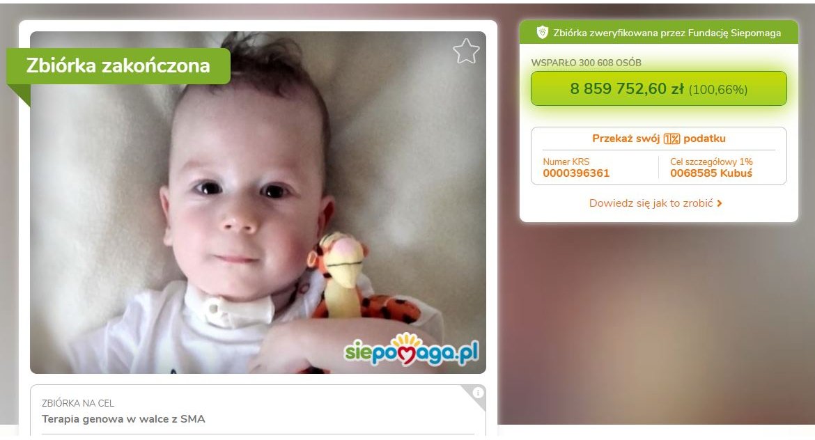 Tą okropną chorobą jest wyjątkowo rzadka SMA typu 1. Czyli po prostu rdzeniowy zanik mięśni. Ta bezlitosna choroba odbiera Kubusiowi władzę nad ciałem. Jego mięśnie słabną, nie może już nawet sam przełykać! Do walki z SMA potrzebuje najdroższego leku świata. Właśnie tej wspomnianej terapii genowej. Kiedy rodzice zaczynali walkę o jego życie, suma blisko 9 milionów złotych wydawała się przekraczać nawet wyobrażenia. Ale bardzo szybko w pomoc w zebranie tak gigantycznej kwoty zaangażowała się grupa ludzi. Potem większa, później jeszcze większa i jeszcze większa, aż się nazbierało.