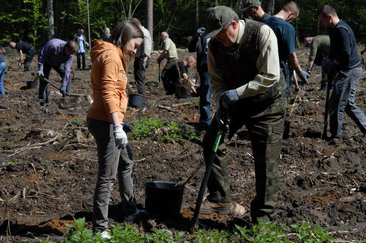 Rozpoczyna się sadzenie. W pierwszej parze specjaliści od urządzana lasu z białostockiego oddziału BULiGL. Za nimi mundury straży pożarnej, celników, straży granicznej, leśników, służby więziennej, policji, inspekcji transportu drogowego i wojska, przeplatają się z cywilnymi ubraniami – samorządowców, przyrodników, pracowników administracyjnych. Wszyscy, niezależnie od stroju, sadzą las. Dookoła soczysta zieleń wiosennej przyrody, czyste niebieskie niebo, gwar rozmów przeplata się ze śpiewem ptaków. Sadzący przesuwają się, systematycznie zmniejszając odległość do przeciwległej ściany lasu.