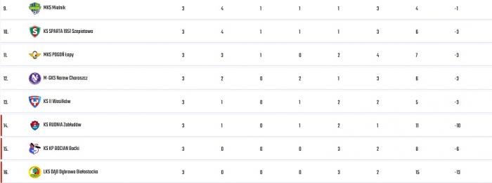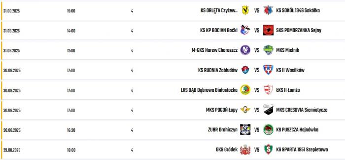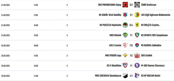 Puszcza Hajnówka - Orlęta Czyżew 0:4 (0:1). Bramki: Dawid Śliwowski 13, 73, Paweł Kossyk 24, Filip Stypułkowski 81. Żółte kartki: Krystian Bogacewicz, Adam Langa, Norbert Jendruczek (Puszcza), Paweł Kossyk (Orlęta). Czerwona kartka: Krystian Bogacewicz (53, Puszcza - za 2. żółte). Sędziował: Tomasz Borowski.