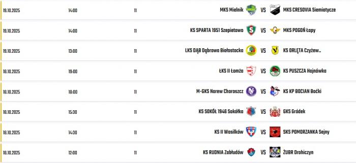 Żubr Drohiczyn - Narew Choroszcz 1:4 (1:2). Bramki: Dominik Zagubień 31 - Patryk Sańko 15, 54, Marcin Jaromiński 19, Michał Kulfan 62. Żółte kartki: Damian Pruski, Rafał Siemieniuk (Żubr), Antoni Macutkiewicz, Jakub Szymborski, Marcin Jaromiński (Narew). Sędziował: Jakub Kolasiński.