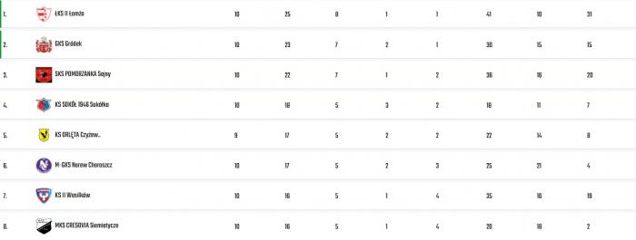 GKS Gródek - Dąb Dąbrowa Białostocka 3:3 (0:1). Bramki: Damian Owerczuk 52, 55, 60 - Michał Grelecki 19, Bartosz Andrysewicz 62-karny, Michał Grelecki 90+2. Żółte kartki: Maciej Szutkiewicz, Paweł Ostaszewski, Damian Owerczuk, Paweł Ostaszewski, Wojciech Olechno, Daniel Owerczuk (GKS), Jakub Łaszczewski (Dąb). Sędziował: Łukasz Postołowicz.