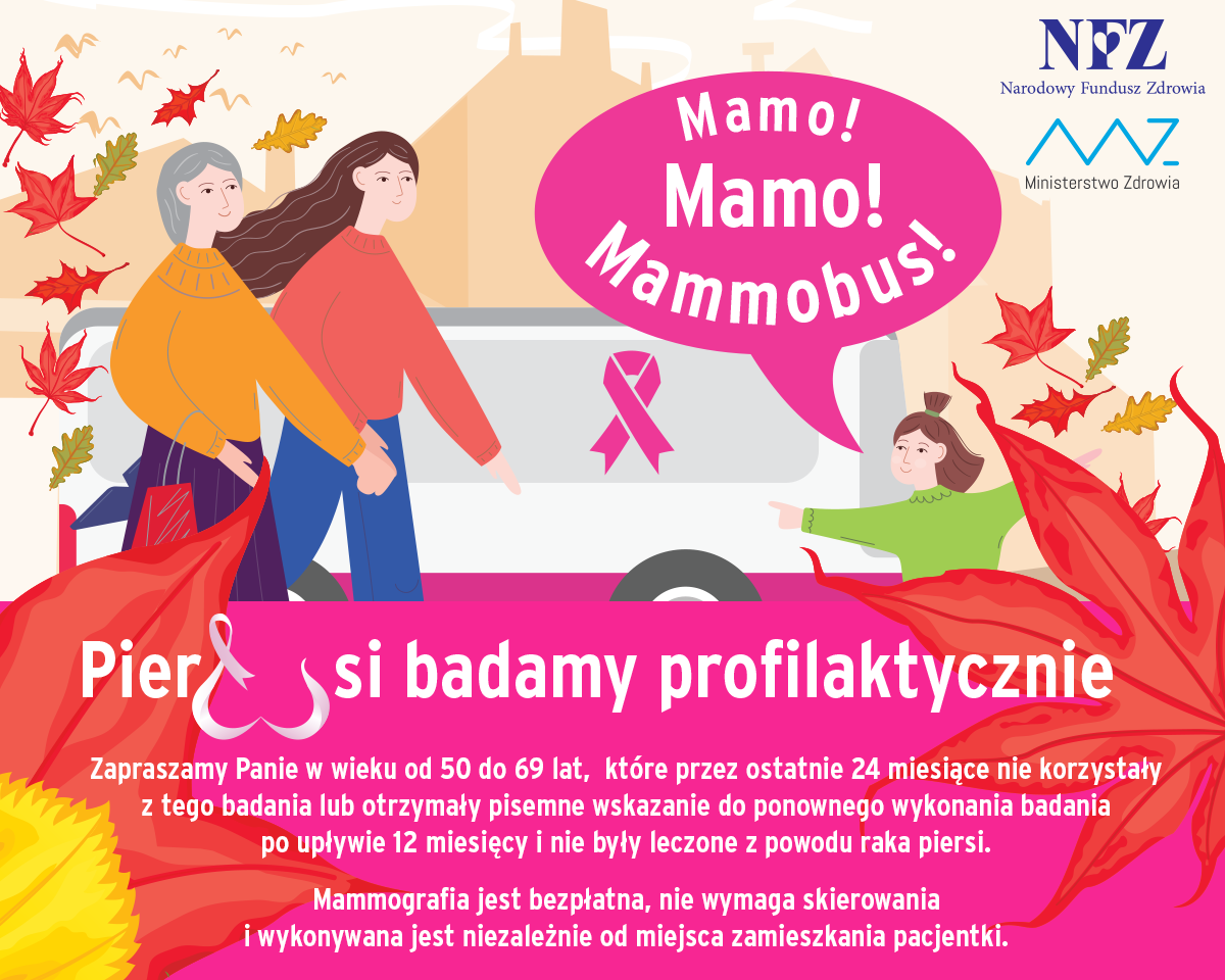 Narodowy Fundusz Zdrowia w listopadzie br. prowadzi akcję „Pier(w)si badamy profilaktycznie” i wraz z Burmistrzem Choroszczy oraz Gminą Choroszcz zaprasza Panie w wieku 50-69 lat na bezpłatne badania mammograficzne. Jest to ważne, ponieważ badania profilaktyczne ratują życie. Mammobus będzie stacjonował we wtorek 9 listopada 2021 roku w godzinach: 9.00-17.00 na Rynku 11 listopada w Choroszczy.