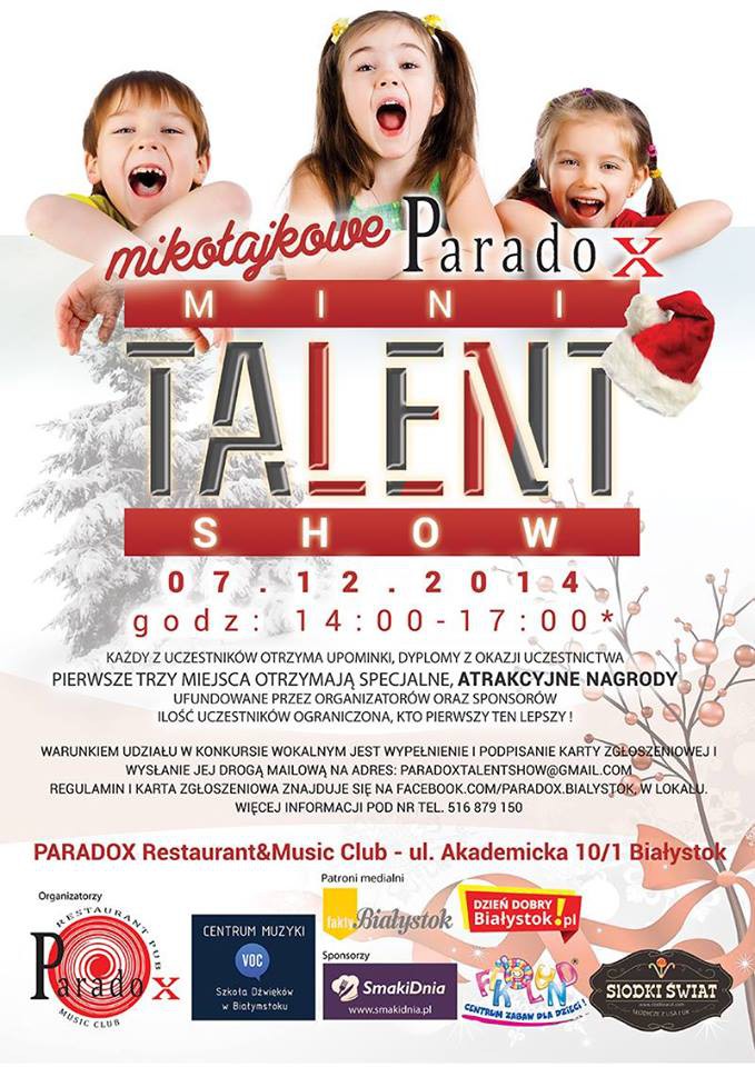 W imieniu organizatora mamy przyjemność zaprosić wszystkie dzieci lubiące śpiewać, przy tym świetnie się bawiące oraz rodziców, którzy chcą spędzić parę godzin ze swoimi pociechami i najbliższą rodziną na Mikołajkowe ParadoX Mini Talent Show.