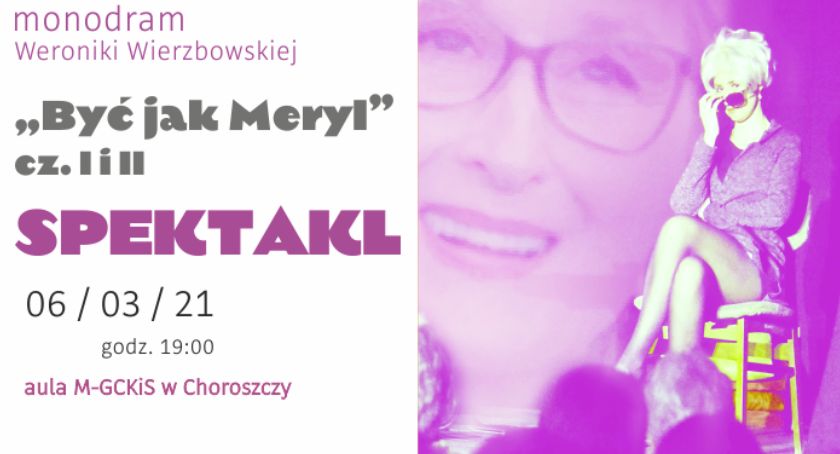 W sobotę, 6 marca, o godz. 19.00 w M-GCKiS, z monodramem „Być jak Meryl” wystąpi Weronika Wierzbowska. Pierwsza część spektaklu gościła już u nas w Choroszczy, tym razem, oprócz części pierwszej, będzie odegrana także część druga, opowiadająca o dalszych losach bohaterki.