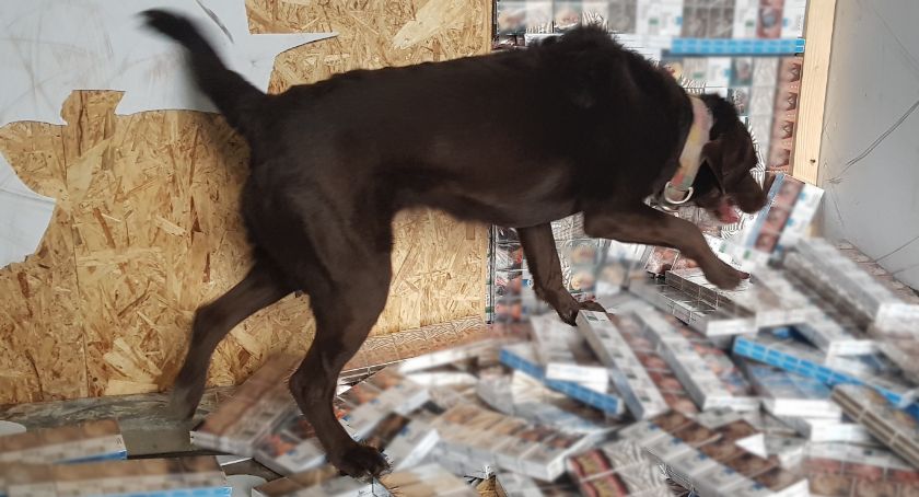 Okazało się jednak, że podczas sprawdzenia naczepy pies służbowy Mila wskazuje jedną ze ścian. Nos czworonożnego funkcjonariusza nie pomylił się - w specjalnie przygotowanej skrytce kierowanego przez 27-letniego Białorusina pojazdu, za tzw. podwójną ścianą, znajdowało się 31 tysięcy paczek ukrytych papierosów.