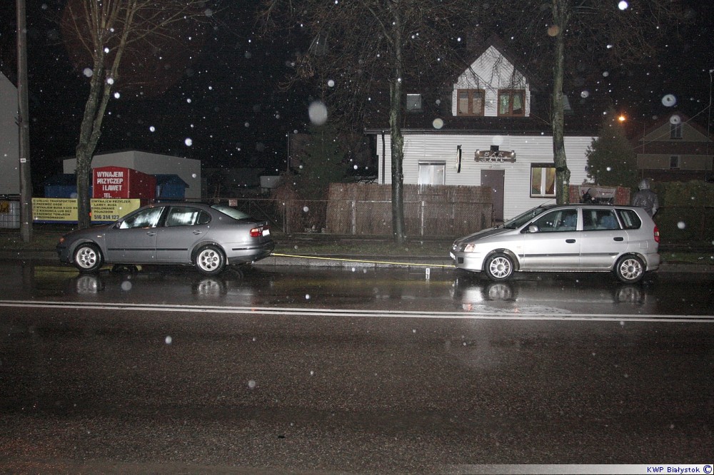 Kierowca seata ciągnął mitsubishi. Auto się zepsuło, więc trzeba było je wziąć na hol. Tak się zdarzyło, że nie można było inaczej się zatrzymać, tylko na przejściu dla pieszych. Zepsute auto stało tuż przed przejściem, a pomocnik musiał ustawić się tuż za przejściem. Starsza kobieta (79 lat) w tym miejscu musiała przekroczyć jezdnię i nie zauważyła linki holowniczej. Zaczepiła się o nią i upadła. Doznała urazu barku, potem trafiła do szpitala.