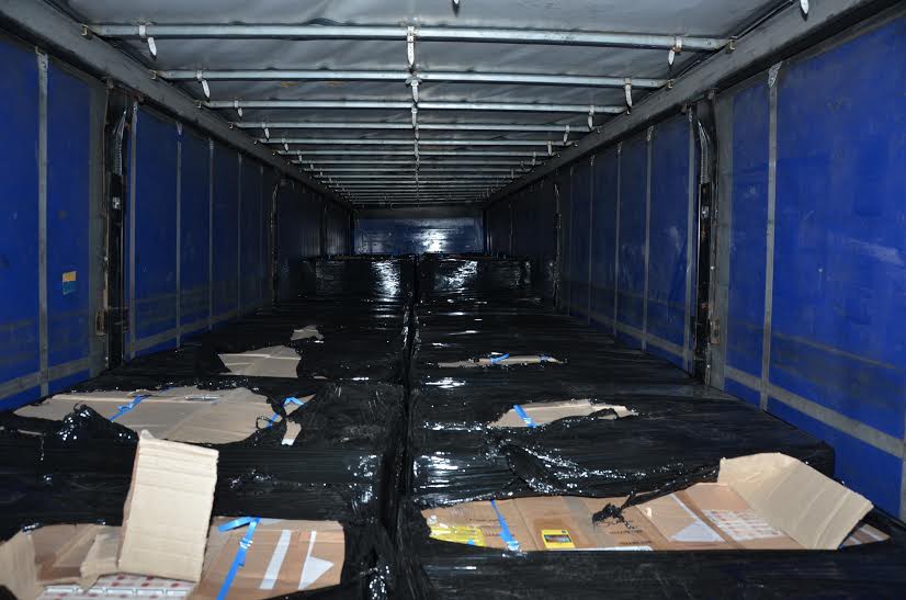 W nocy z poniedziałku na wtorek (17-18.11.2014 r.) funkcjonariusze Wydziału Zabezpieczenia Działań wykonując czynności służbowe na drodze krajowej nr 8 w miejscowości Kumiała (powiat sokólski) wytypowali do kontroli samochód ciężarowy. W trakcie sprawdzania w naczepie pojazdu ujawniono bardzo duże ilości wyrobów tytoniowych. Kierowca – obywatel Polski, przewoził ponad 330 tys. paczek papierosów. W pudłach owiniętych czarną folią znajdowało się ponad 153 tys. paczek papierosów z białoruska akcyzą i 177 tys. paczek papierosów z rosyjską akcyzą. Szacunkowa wartość zatrzymanej kontrabandy to ponad 3 mln 900 tys. zł. Uszczuplenia celno-podatkowe od tej kwoty wynoszą ponad 5 mln. zł.