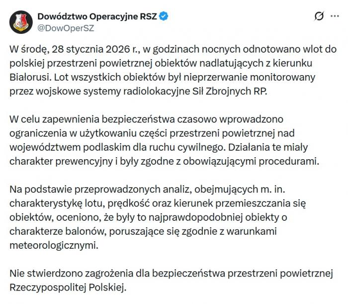 Tej nocy mieszkańcy województwa podlaskiego kolejny raz dowiedzieli się, że nocą ze środy na czwartek (28/29 stycznia 2026 r.) polskie systemy radiolokacyjne wykryły obiekty wlatujące w naszą przestrzeń powietrzną z terytorium Białorusi. Choć wojsko uspokaja, że to „tylko balony”, incydent wymusił wprowadzenie nadzwyczajnych procedur i czasowe zamknięcie nieba dla lotów cywilnych nad naszym regionem.