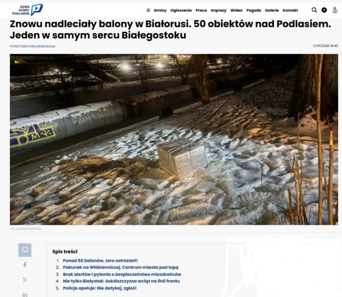 Znowu! To już trzeci kolejny masowy nalot balonów z Białorusi nad teren województwa podlaskiego. Przypomnijmy: w noc wigilijną nadleciało aż 60 balonów znad wschodniej granicy. Następny raz balony ze wschodu naruszyły polską przestrzeń powietrzną w nocy z 16 na 17 stycznia. Wówczas jeden z nich spadł w ścisłym centrum Białegostoku. W nocy ze środy na czwartek (28-29 stycznia) kolejny raz wleciało kilkadziesiąt balonów. Kiedy to się skończy?