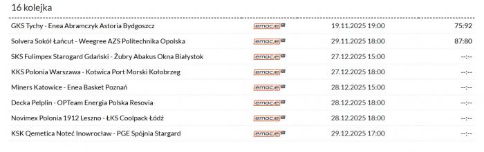 Mecze PGE Spójnia Stargard - KKS Polonia Warszawa, Enea Basket Poznań - OPTeam Energia Polska Resovia, Weegree AZS Politechnika Opolska - GKS Tychy - 21 grudnia.
