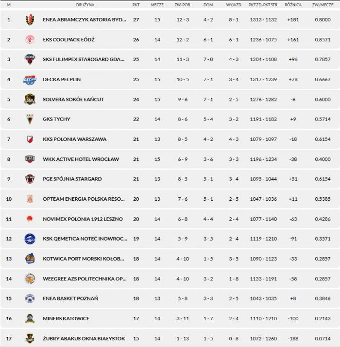 Wyniki 15. kolejki: Enea Abramczyk Astoria Bydgoszcz - Fulimpex Starogard Gdański 71:79, WKK Active Hotel Wrocław - Decka Pelplin 92:99, Kotwica Port Morski Kołobrzeg - Novimex Polonia 1912 Leszno 67:70, ŁKS Coolpack Łódź - Solvera Sokół Łańcut 98:77.