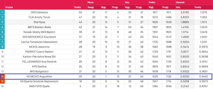 Porażka ta ma niestety swoje konsekwencje w ligowym zestawieniu. KS Necko Augustów spadło z 13. na 14. miejsce w tabeli PLS 1. Ligi z dorobkiem 20 punktów. Na szczyt tabeli wrócił GKS Katowice, korzystając z potknięcia CUK Aniołów Toruń.