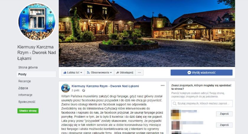 „Witam Państwa musieliśmy założyć drugi fanpage, gdyż nasz główny został usunięty przez facebooka przez przypadek i do dziś nie chcą go przywrócić. Żadne biuro obsługi klienta ani facebook support nie odpowiada. Zwróciliśmy się do Ministerstwa Cyfryzacji które interweniowało do facebooka i napisało do nas, że facebook przyznał, że usunął fanpage przez pomyłkę. Problem w tym, że to było 8 kwietnia i do dziś dalej się nie pojawił. Lata pracy przez "przypadek" zostały skasowane, rozumiemy, że przypadki zdarzają się w tak wielkim serwisie ale w dobie koronawirusa trzy miesiące bez fanpage i utrata możliwości kontaktowania się z klientami to ogromny cios i dosłownie olanie całkowite firmy, która regularnie wydaje pieniądze na reklamy płatne. Prosimy o pomoc w nagłośnieniu tego i udostępnianiu tego posta” – napisał administrator na zupełnie nowym profilu Kiermusy Karczma Rzym - Dworek Nad Łąkami.