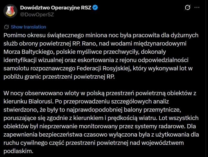 Nocne emocje na wschodzie kraju to nie wszystko. Rano, w pierwszy dzień świąt, polskie myśliwce zostały poderwane do lotu nad wodami międzynarodowymi Morza Bałtyckiego. Powodem była obecność samolotu rozpoznawczego Federacji Rosyjskiej, który wykonywał lot w pobliżu granic polskiej przestrzeni powietrznej. Dyżurna para klucza dokonała identyfikacji wizualnej maszyny, a następnie eskortowała ją poza polski rejon odpowiedzialności. Choć takie incydenty zdarzają się regularnie, ich nagromadzenie w czasie świąt wymusiło pełną gotowość wszystkich sił i środków obrony.