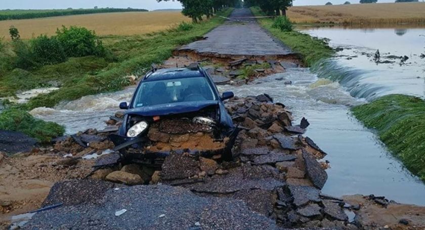 W nocy z 21 na 22 lipca przez województwo podlaskie przeszły gwałtowne burze, dokonując sporych szkód. Do groźnego zdarzenia doszło na drodze Mońki - Kalinówka Kościelna, gdzie odcinek szosy został dosłownie zmyty przez napierającą, szukającą ujścia drogę. W wyrwie utknął samochód. Kierowca Volkswagena Golfa prawdopodobnie nie zauważył w porę, że może być niebezpiecznie.