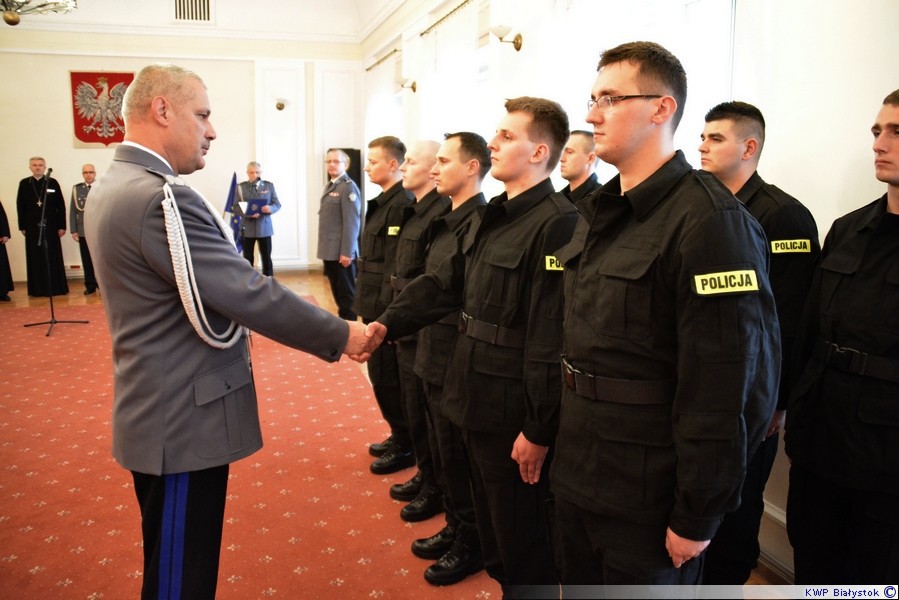 Wczoraj w Komendzie Wojewódzkiej Policji w Białymstoku odbyło się uroczyste ślubowanie nowych funkcjonariuszy przyjętych do służby w podlaskim garnizonie Policji. Słowa roty ślubowania wypowiedziało 10 policjantów, którzy sprostali wymogom stawianym kandydatom do służby i przeszli wszystkie etapy postępowania kwalifikacyjnego. Przed Podlaskim Komendantem Wojewódzkim Policji nadinspektorem Sławomirem Mierzwą funkcjonariusze ślubowali m.in. „Strzec bezpieczeństwa państwa i jego obywateli nawet z narażeniem życia…”.