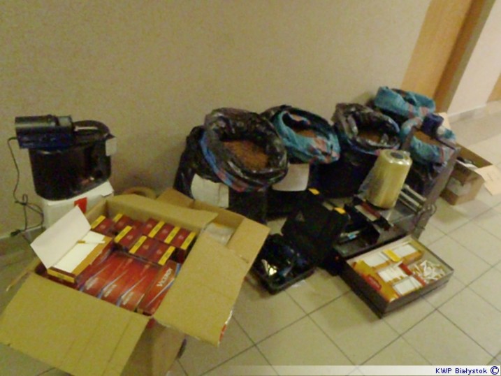 Funkcjonariusze Komendy Miejskiej Policji w Białymstoku ustalili, że w jednym z mieszkań w Sokółce mogą być przechowywane wyroby tytoniowe bez polskich znaków skarbowych akcyzy. Podczas przeszukania mieszkania ujawnili i zabezpieczyli 5 worków 120-litrowych zawierających gotowy do produkcji papierosów susz tytoniowy o łącznej wadze ponad 66 kg. Były tam również dwie maszynki do robienia papierosów, puste opakowania oraz cały osprzęt do samodzielnego wyrobu.
