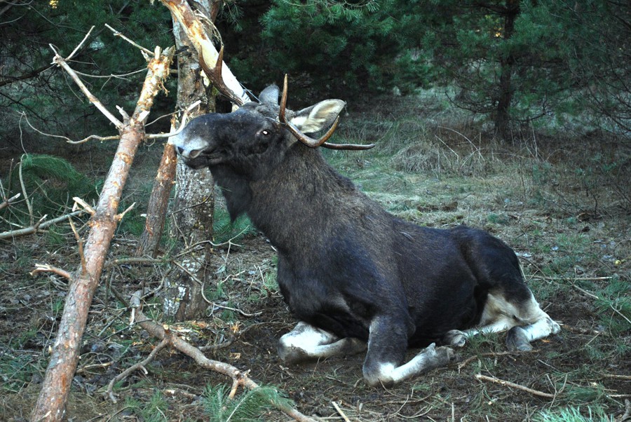 Łoś mimo kiepskiej kondycji i ogólnego wyczerpania był cały czas agresywny. Zaplątany w stalową pętlę, daremnie próbował wyzwolić się z zastawionej pułapki. Mimo złamania pułapkowej sosny i kilku innych dookoła nie miał szans na samodzielne oswobodzenie.