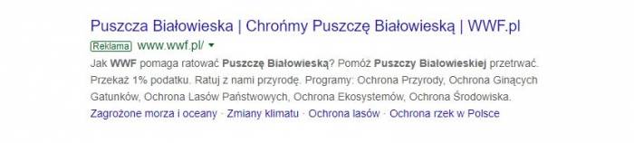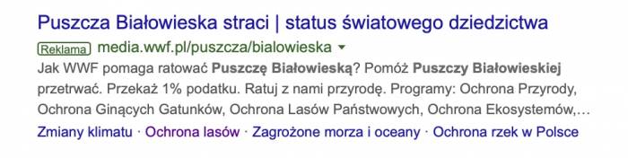 „Szanowni Państwo, w odpowiedzi na liczne pytania i uwagi kierowane przez Państwa w sprawie reklamy prezentowanej w wynikach wyszukiwania Google informujemy, że Puszcza Białowieska nie została wpisana na listę światowego dziedzictwa w zagrożeniu. Informacje zaprezentowane w reklamie emitowanej w wynikach wyszukiwania Google są nieprawdziwe. Za emisję powyższej reklamy odpowiedzialna jest Fundacja WWF Polska. Treści zastosowane w reklamie w formie oznajmiającej nie mają nic wspólnego ze stanem faktycznym i wprowadzają opinię publiczną w błąd” – przekazały Lasy Państwowe jeszcze w ubiegłym tygodniu na swojej oficjalnej stronie internetowej.