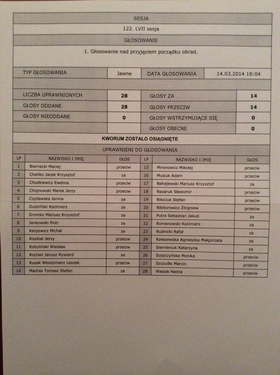 Jako radny postawiłem sobie za cel wprowadzenie do naszego samorządu inicjatywy Budżetu Obywatelskiego. Proszę mi uwierzyć - była to trudna droga. Przez długi czas wiele drzwi w naszym magistracie, w tym te najważniejsze, na IV piętrze, było zamkniętych dla tego projektu. Pomimo wielu przeciwności udało się. Budżet Obywatelski w naszym mieście został przyjęty z wielkim entuzjazmem, pobudzając do aktywności uśpione dotąd środowiska, które nade wszystko cenią obywatelskość i działanie na rzecz lokalnej społeczności. Kolejnym etapem mojej pracy było obserwowanie działań innych samorządów i poszukiwanie najlepszych rozwiązań dla idei Budżetu Obywatelskiego i mieszkańców miasta. W tym celu przygotowałem autorski projekt uchwały w sprawie zasad konsultacji Budżetu Obywatelskiego. Dziś odbyła się nadzwyczajna sesja Rady Miasta, na której projekt miał zostać przyjęty. Niestety, ku memu wielkiemu zaskoczeniu, dotąd deklarujący poparcie dla idei Budżetu Obywatelskiego radni Platformy Obywatelskiej, Forum Mniejszości Podlasia, oraz radny z Solidarnej Polski, a także radni Mikołaj Mironowicz i Wiesław Kobyliński zagłosowali przeciwko porządkowi obrad, gdzie jedynym punktem było właśnie uchwalenie wspomnianych konsultacji dla mieszkańców, nie dopuszczając nawet do dyskusji na ten temat.