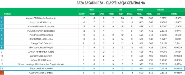 Ślepsk: Jan Nowakowski 7, Karol Jankiewicz 0, Henrique Honorato 8, Bartosz Filipiak 11, Kamil Droszyński 0, Bartosz Mariański (libero), David Smith 3, Joachim Paou 0, Jakub Kubacki (libero), Antoni Kwasigroch 1, Asparuh Asparuhov 9, Damian Wierzbicki 0.