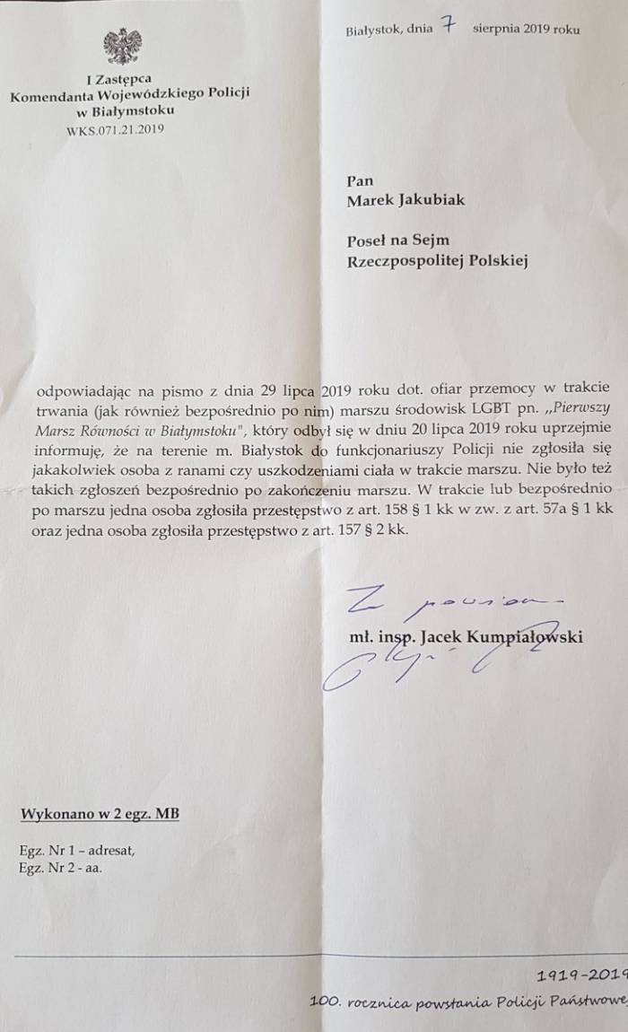 „Odpowiadając na pismo z dnia 29 lipca 2019 roku dot. ofiar przemocy w trakcie trwania (jak również bezpośrednio po nim) marszu środowisk LGBT pn. „Pierwszy Marsz Równości w Białymstoku”, który odbył się 20 lipca 2019 roku uprzejmie informuję, że na terenie m. Białystok do funkcjonariuszy Policji nie zgłosiła się jakakolwiek osoba z ranami czy uszkodzeniami ciała w trakcie marszu. Nie było też takich zgłoszeń bezpośrednio po zakończeniu marszu. W trakcie lub bezpośrednio po marszu jedna osoba zgłosiła przestępstwo z art. 158 § 1 kk w zw. z art. 57a § 1 kk oraz jedna osoba zgłosiła przestępstwo z art. 157 § 2 kk” – odpisał posłowi Jakubiakowi mł. insp. Jacek Kumpiałowski I zastępca Komendanta Wojewódzkiego Policji w Białymstoku.