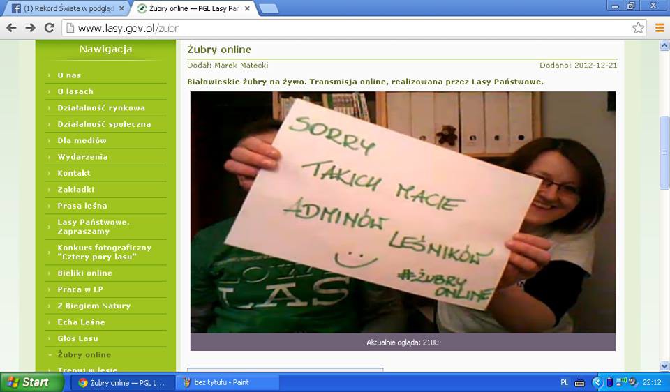 Fan page żubrów liczy już prawie 80 tys. fanów. Żubry można zaś podglądać do woli na stronie http://www.lasy.gov.pl/zubr