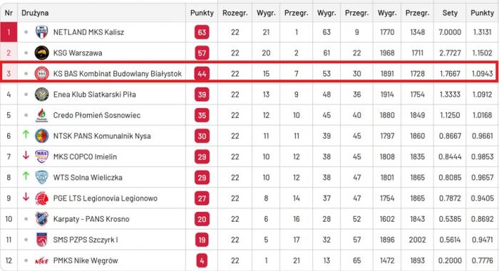 BAS KB Białystok: Dominika Surlit 10, Katarzyna Stepko 10, Martyna Szczepuła 15, Pola Nowacka 19, Monika Karnicka 9, Paulina Bałdyga 1, Brittany McGlashan (libero), Amelia Senica 11, Natalia Bandurska 0.