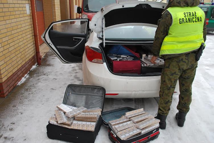 W miniony poniedziałek (25.01.2016 r.) funkcjonariusze Straży Granicznej pełniący służbę na terenie gminy Płaska zatrzymali do kontroli pojazd marki Hyundai na białoruskich numerach rejestracyjnych. W trakcie sprawdzania auta, w walizkach znajdujących się w bagażniku, funkcjonariusze znaleźli3 tys. paczek papierosów bez polskich znaków skarbowych akcyzy. Szacunkowa wartość kontrabandy to blisko 40 tys. zł.