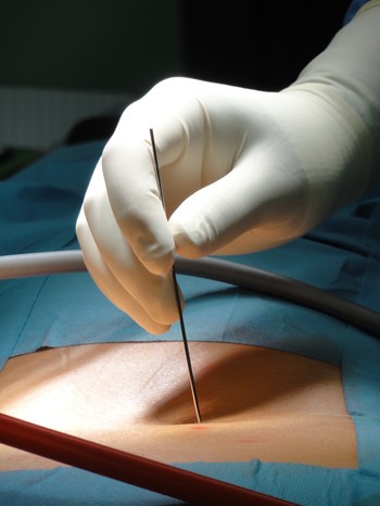 Celem termolezji, metody leczenia bólu za pomocą prądu o wysokiej częstotliwości fal radiowych, jest uszkodzenie patologicznych struktur nerwowych poprzez kontrolowane działanie wysokiej temperatury. Ten zabieg również wykonywany jest w znieczuleniu miejscowym. Pod kontrolą RTG lekarz operator wkłuwa specjalną igłę w okolice patologicznie zmienionych zakończeń nerwowych, które mają zostać wyłączone pod wpływem wysokiej temperatury. Długość igły dobiera się w zależności od miejsca wkłucia. Po ustaleniu prawidłowej lokalizacji elektrody, wykonujemy właściwy zabieg. Tępy koniec jest połączony z generatorem wysokich fal, które rozchodzą się w patologicznie zmienionych tkankach. Wykorzystujemy prąd pulsacyjny o częstotliwości radiowej, czyli 300 do 500 kHz, dochodzi do wzrostu temperatury do 60-80° C – wyjaśnia dr Bartłomiej Bartoszcze, specjalista ortopedii i traumatologii z Centrum Medycznego ENEL-MED.