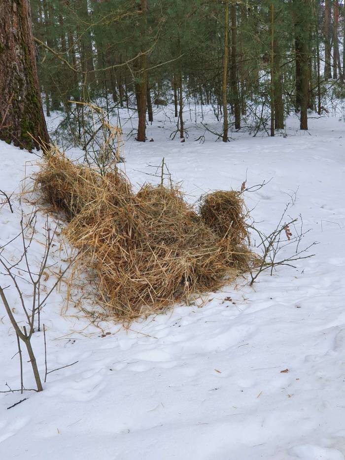 Komuś mocno zabrakło wyobraźni, ale komu? Tego nie wiadomo. Faktem jednak jest, że ktoś położył siano, aby dzikie zwierzęta miały co jeść, kiedy wszystko jest zasypane śniegiem. Problem polega na tym, że pomagać trzeba z głową, a w tym przypadku nie bardzo ta głowa funkcjonowała zanim podjęto działania.
