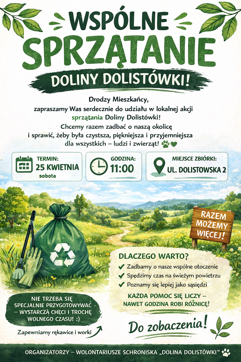Wspólna praca w Dolinie Dolistówki to również szansa na poznanie osób, które na co dzień opiekują się bezdomnymi zwierzętami, i wymianę doświadczeń. Pokazanie, że los naszej najbliższej okolicy nie jest nam obojętny, buduje silniejszą, bardziej świadomą wspólnotę. Do zobaczenia pod bramą schroniska!