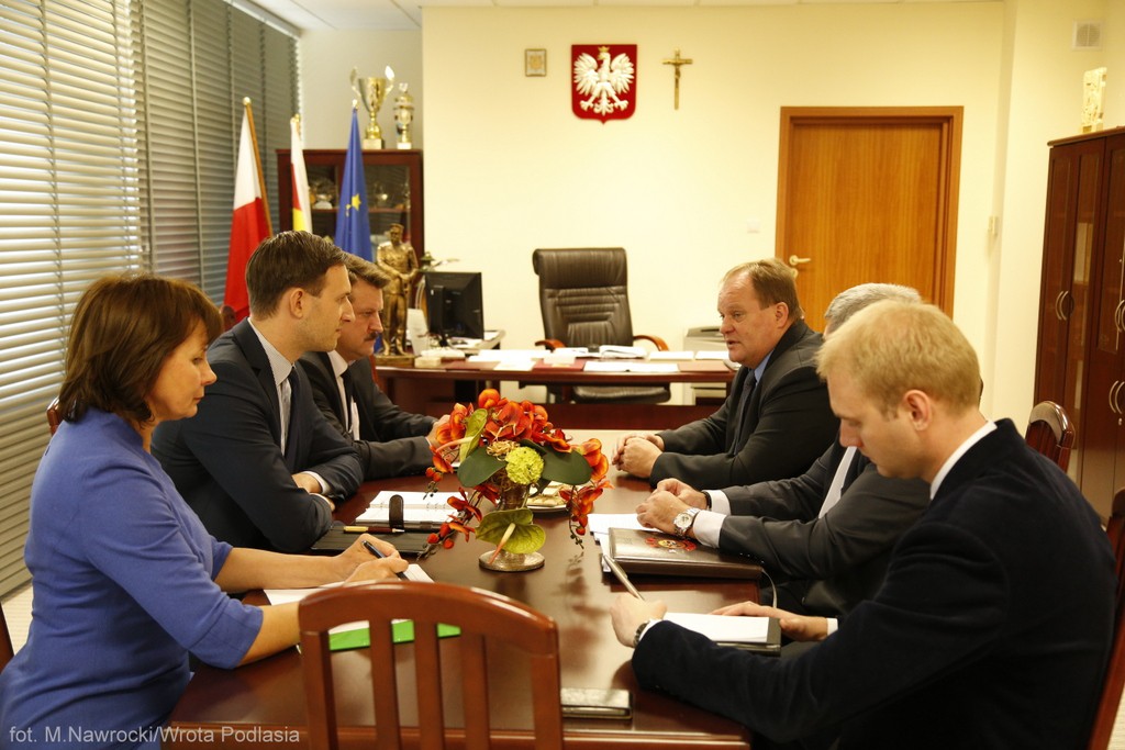Marszałek Mieczysław Baszko spotkał się z przedstawicielami dyrekcji Przewozów Pasażerskich Spółki Koleje Litewskie, dyrektorem departamentu technicznego Stanisławem Łuczyńskim i zastępcą dyrektora departamentu obsługi Andriusem Pietruszysem.