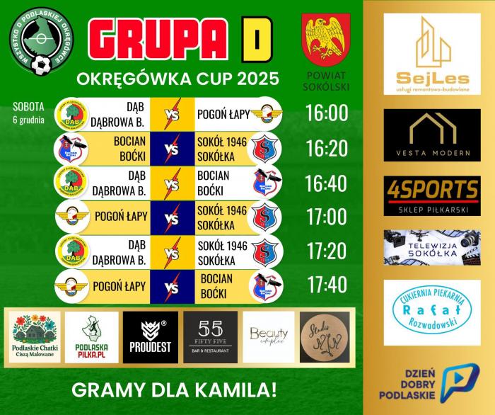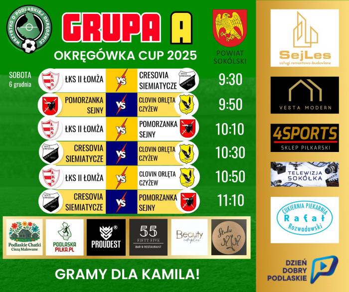 W czasie turnieju odbywać się będzie kiermasz słodkości, które będzie można zakupić. Pochodzą one z rąk utalentowanych pań z Krynek, które słyną z przepysznych wypieków oraz z zaprzyjaźnionej cukierni. Patronów, którzy wsparli organizację turnieju, włączyli się w organizację turnieju oraz pomogli Kamilowi w organizacji jest naprawdę wielu. Wszystkich wymieniamy pod artykułem. Wielu z nich - być może wszystkich - poznacie w czasie turnieju, który rozpoczyna się w sobotę od godzinie 9.30 i potrwa prawie go godziny 18.00. Rywalizować w nim będzie 16 ekip z podlaskiej okręgówki, które stoczą towarzyskie boje (terminarz w grafikach zamieszonych poniżej). Do niedzielnych gier, które rozpoczną się o godzinie 10.00 w niedzielę zakwalifikują się po dwie najlepsze ekipy z każdej z grup.