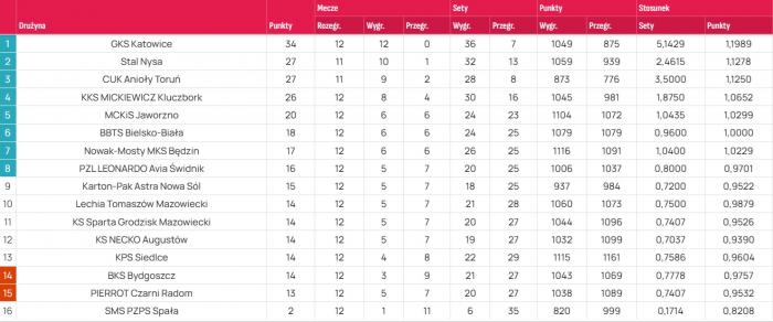 Wyniki 12. kolejki: PIERROT Czarni Radom - SMS PZPS Spała 3:0, BBTS Bielsko-Biała - KKS MICKIEWICZ Kluczbork 0:3, KPS Siedlce - Sparta Grodzisk Mazowiecki 2:3, GKS Katowice - Karton-Pak Astra Nowa Sól 3:0, NECKO Augustów - PZL LEONARDO Avia Świdnik 0:3, MCKiS Jaworzno - Lechia Tomaszów Mazowiecki 3:1, BKS Bydgoszcz - Nowak-Mosty MKS Będzin 0:3. Stal Nysa - CUK Anioły Toruń (30 listopada, 17.00).