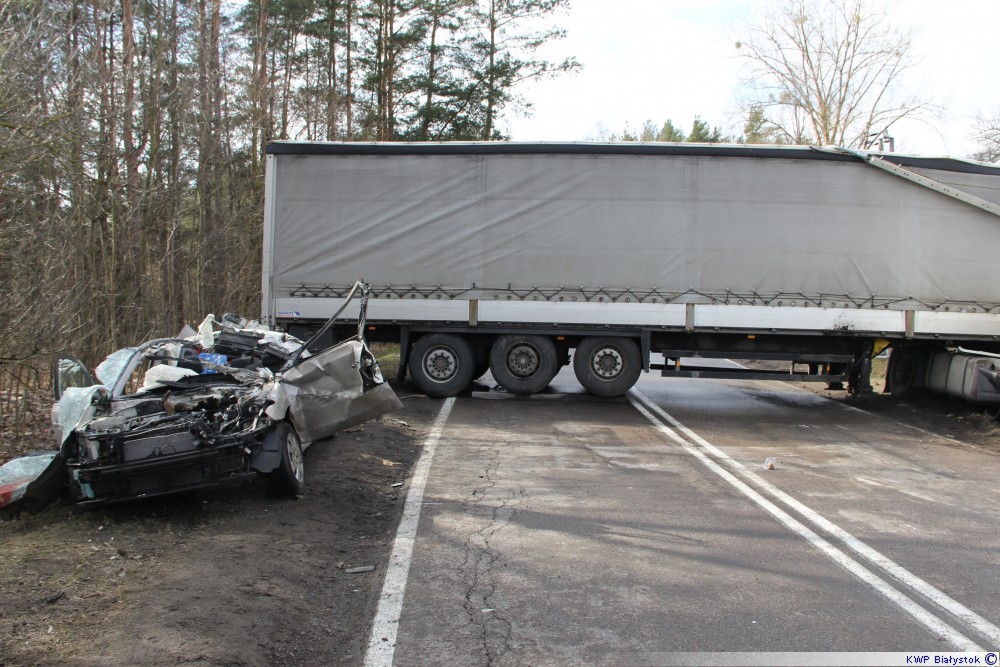 Dwie osoby podróżujące hyundaiem zginęły w wyniku zderzenia z naczepą ciężarowej scanii. Siedzący za kierownicą samochodu ciężarowego 46-latek był trzeźwy, został zatrzymany. Szczegółowe okoliczności i przyczyny tego tragicznego wypadku wyjaśniają białostoccy policjanci.