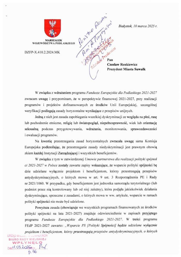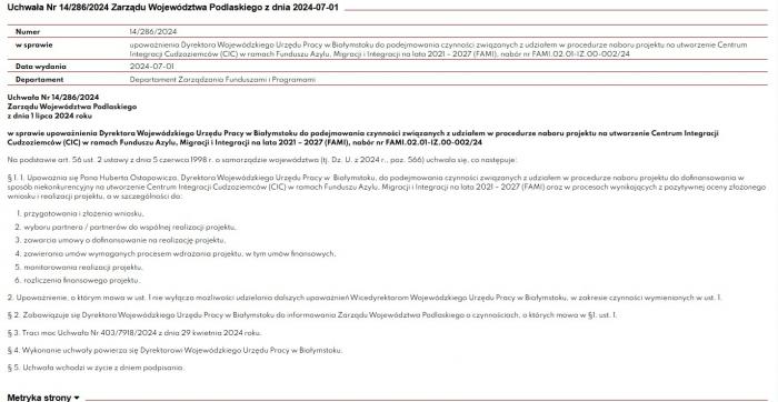 Kluczowym momentem w działaniach zarządu była uchwała z 1 lipca 2024 roku, która upoważniła Wojewódzki Urząd Pracy do przygotowania projektu w ramach Funduszu Azylu, Migracji i Integracji (FAMI). Niecały tydzień później do współpracy wybrano Caritas Archidiecezji Białostockiej, Caritas Diecezji Ełckiej oraz Fundację Vita Familiae, co doprowadziło do stworzenia projektu obejmującego Białystok, Suwałki i Łomżę. Projekt ten uzyskał pozytywną ocenę Ministerstwa Spraw Wewnętrznych i Administracji, co zaowocowało przyznaniem unijnych środków finansowych.
